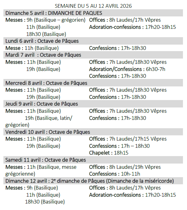 Laudes Du mardi au vendredi : 7hSamedi et dimanche : 8hVêpres Mardi et jeudi : 18h30 – Vendredi : 17h15Samedi : 19h (1e vêpres solennelles)Dimanche : 17h (2e vêpres solennelles)